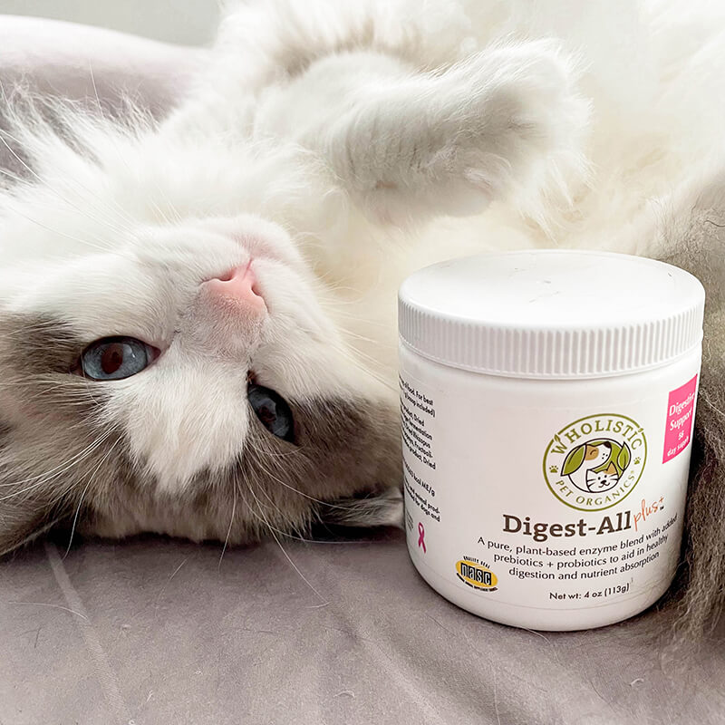 Wholistic Pet Organics digestive support supplements with plant based enzymes and probiotics for healthy digestion in dogs and cats