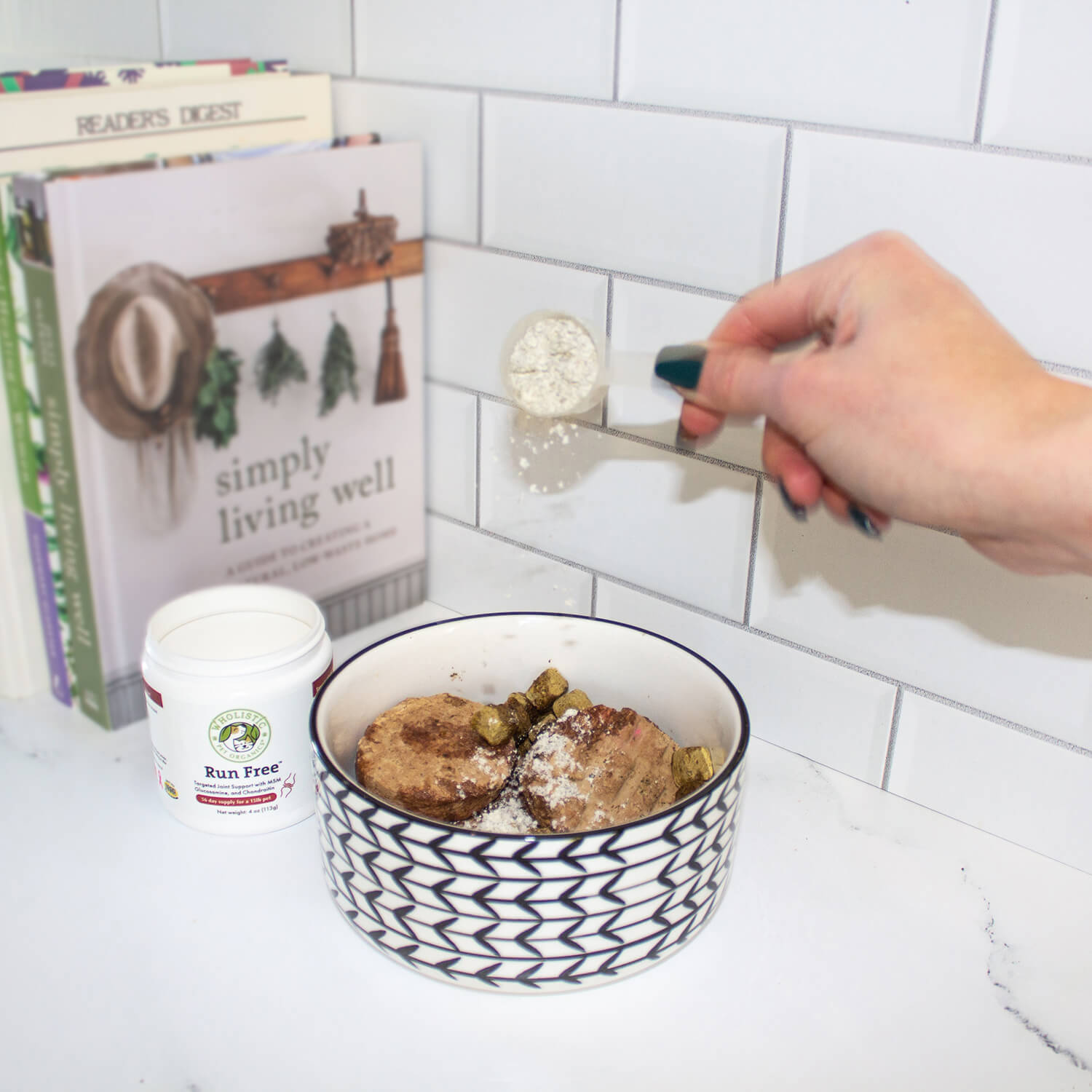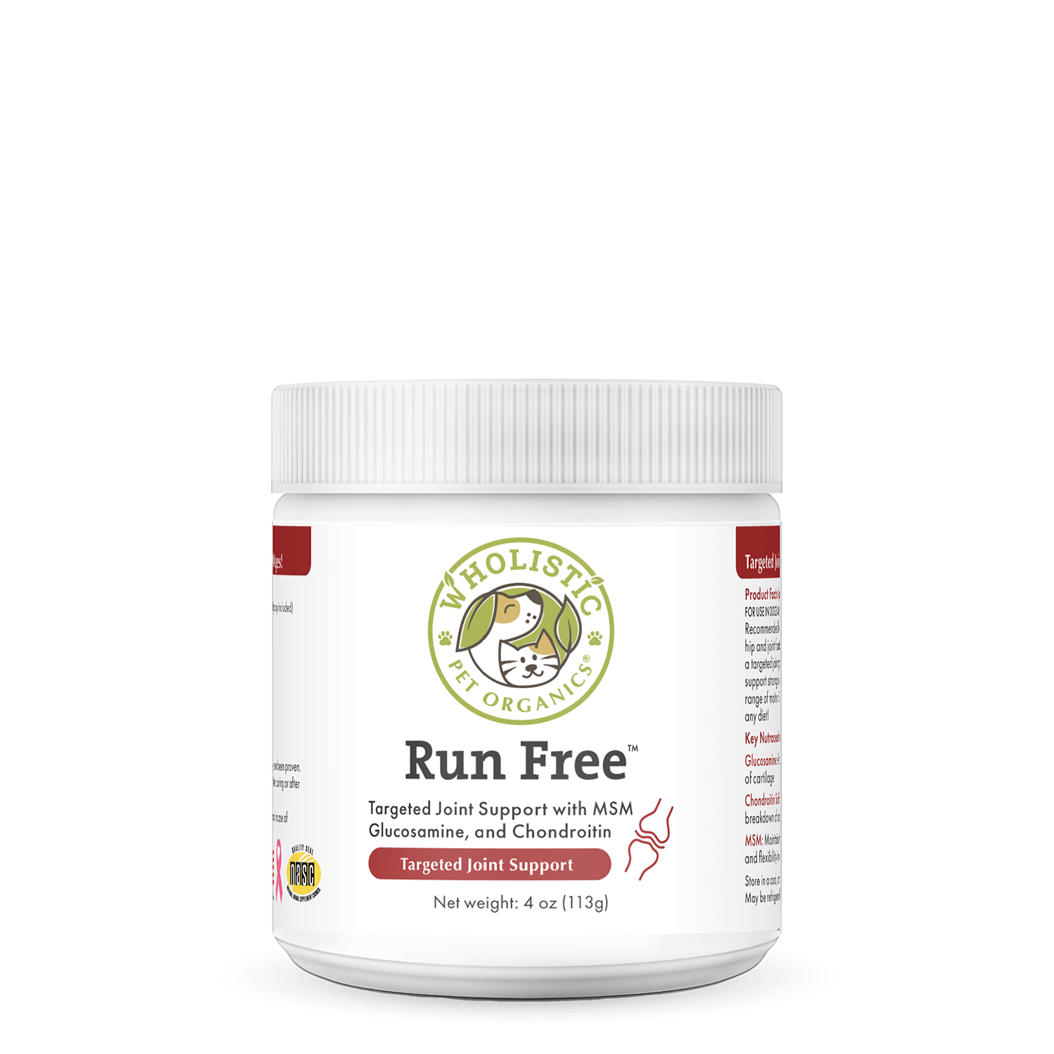 I really like the Wholistic Pet Organics “Run Free - Targeted Joint Support” powder supplement. It’s very easy to mix into my dogs’ meals and gives me confidence knowing it’s formulated with proven joint-nutrients like glucosamine, chondroitin and MSM for hip and joint support.