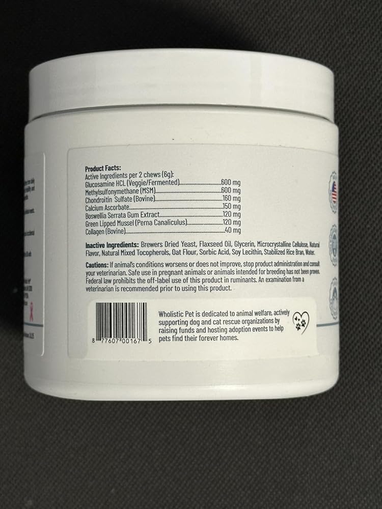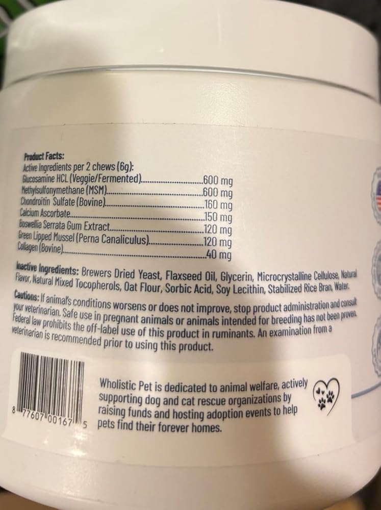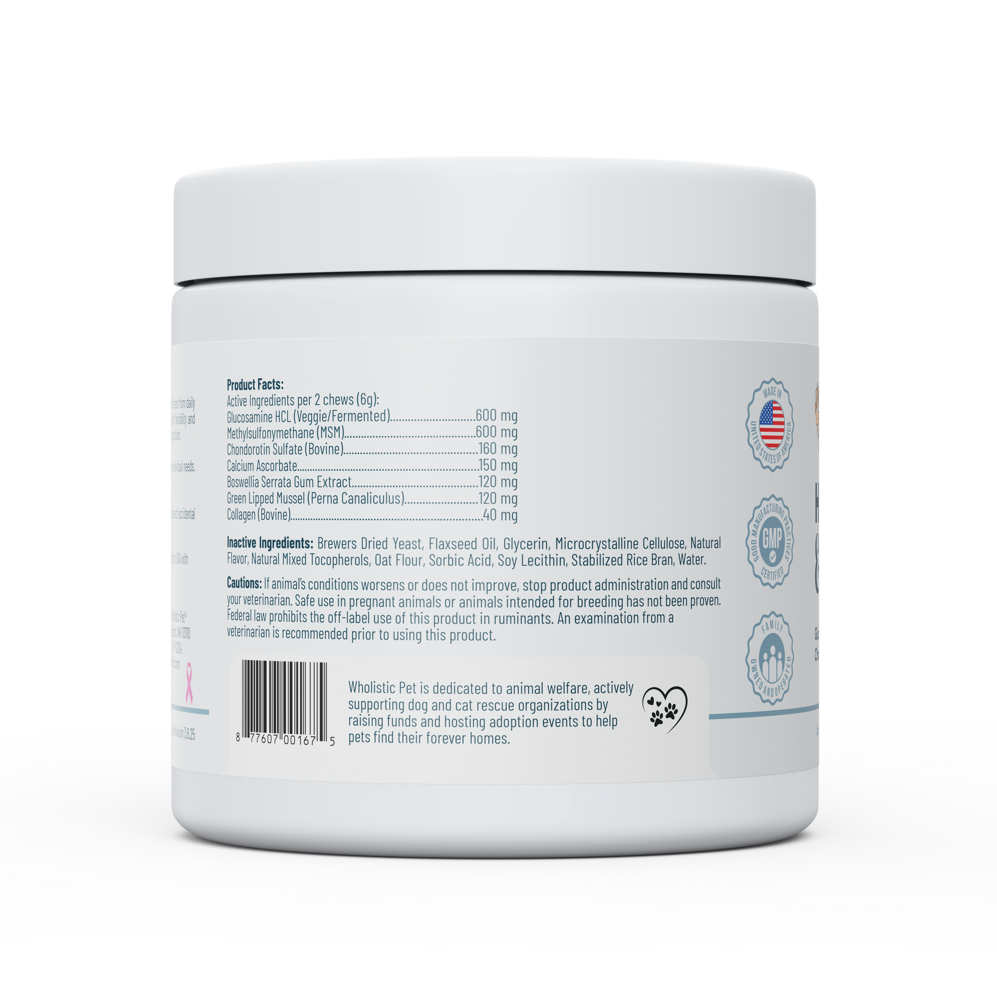 Wholistic Pet® Hip & Joint Soft Chews are designed to support your dog's mobility, flexibility, and overall joint health. Featuring Glucosamine, MSM, and green-lipped mussels, this formula supports joint flexibility and comfort during normal aging and activity.