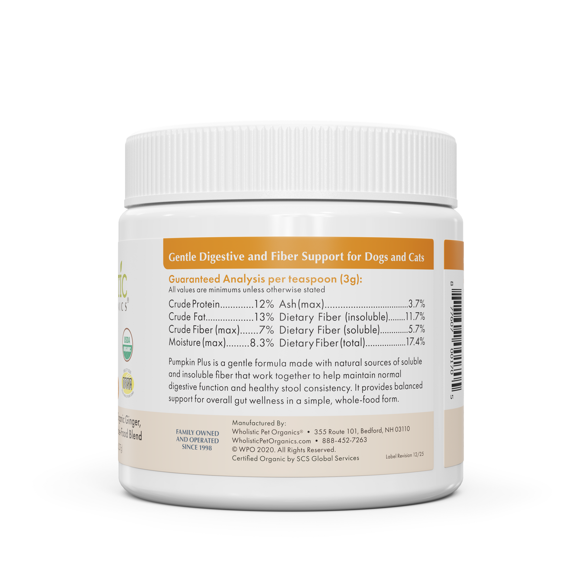 Organic Pumpkin Plus is a whole food digestive support blend designed to promote healthy digestion, balanced stools, and gut comfort for dogs and cats of all life stages. Built around organic pumpkin and complementary fiber-rich whole foods, it delivers gentle digestive support in a form the body naturally recognizes and utilizes. Organic Pumpkin Plus supports regularity, microbiome balance, and overall gut health through consistent daily use.